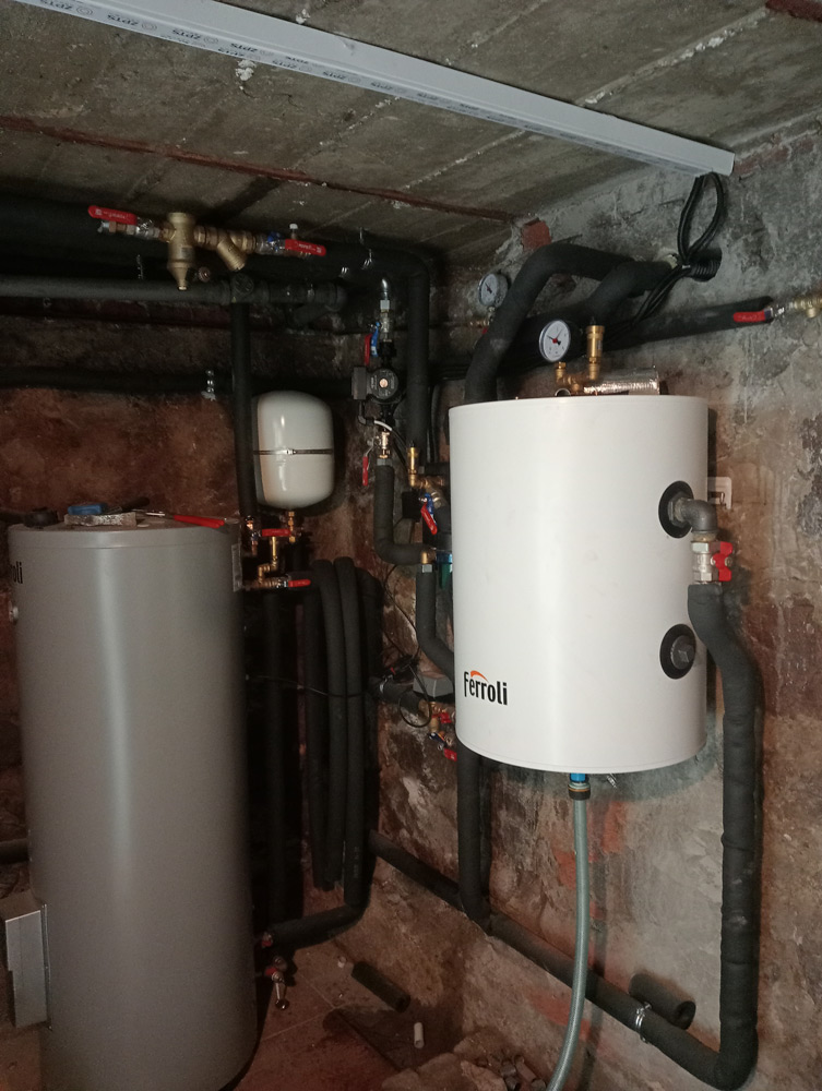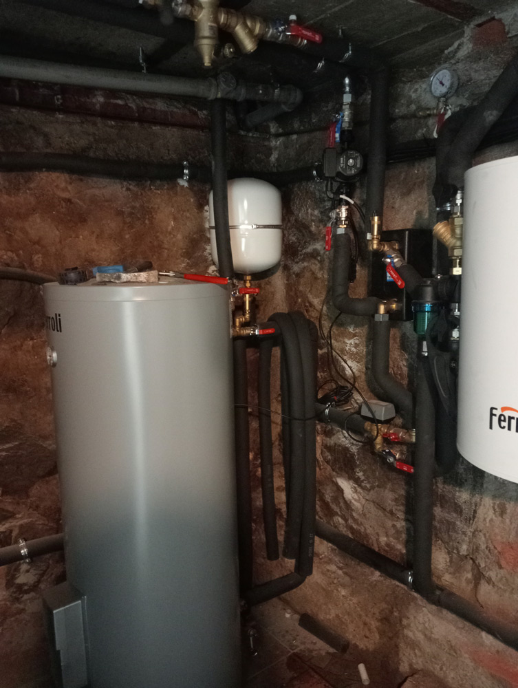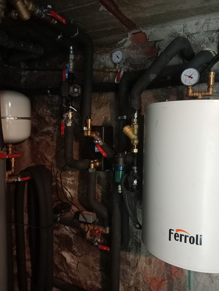 Urządzenie zostało inteligentnie zintegrowane z posiadanym przez Klienta kotłem stałopalnym. Dzięki takiemu rozwiązaniu kocioł może wspomagać system w okresach największego zapotrzebowania na ciepło lub stanowić w pełni funkcjonalne, alternatywne źródło ogrzewania. Kluczowym elementem zapewniającym efektywną współpracę obu jednostek jest bufor ciepła, który magazynuje energię cieplną. W instalacji zastosowano również wymiennik płytowy, pełniący istotną rolę w separacji hydraulicznej lub transferze ciepła między obiegami systemu.