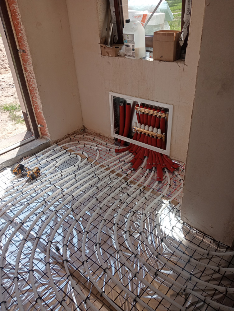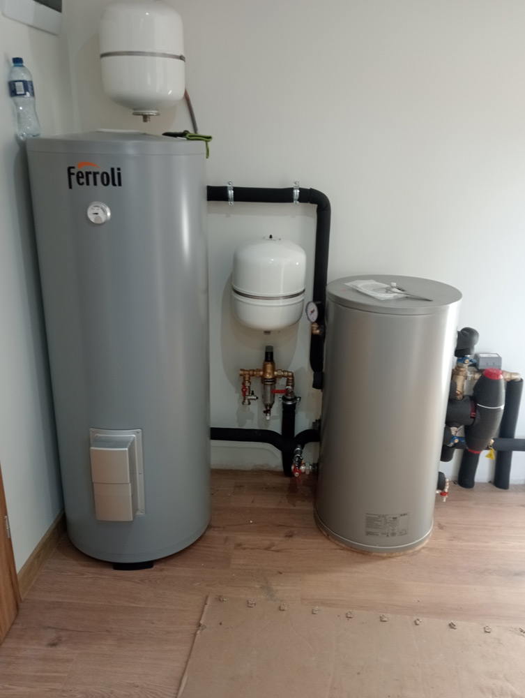 System uzupełnia dedykowany zbiornik ciepłej wody użytkowej (CWU) marki Ferroli. W części technicznej (kotłowni) zainstalowaliśmy również bufor dla optymalizacji pracy pompy ciepła oraz zaawansowany separator powietrza i zanieczyszczeń Flamco, który znacząco wpływa na żywotność i wydajność całej instalacji grzewczej.