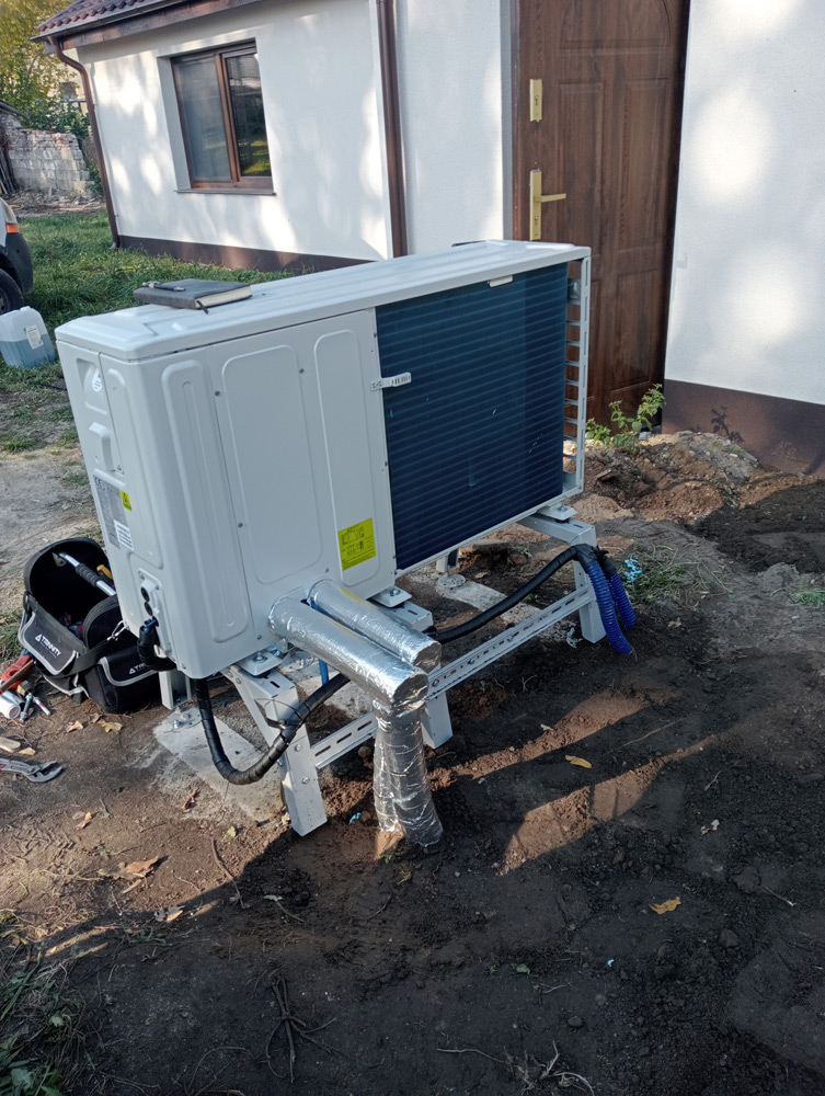 Sercem systemu grzewczego jest energooszczędna pompa ciepła powietrze-woda Kaisai Monoblock o mocy 6 kW. Jej obieg, dla zapewnienia bezawaryjnej pracy w niskich temperaturach, zalany jest roztworem glikolu. Ciepło w budynku dystrybuowane jest za pomocą efektywnego ogrzewania podłogowego.